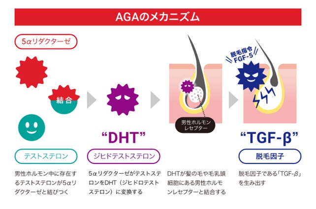 体内の酵素「5αリダクターゼ」によってテストステロンがDHTに変換され、これが毛根の受容体と結びつくことで脱毛因子が活性化し、成長期が短縮されていきます。
