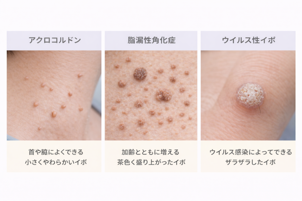 首元にできるポツポツは、医学的には「イボ」と総称される皮膚の良性変化であることが多いです。ただし一種類ではなく、いくつかのタイプがあります。