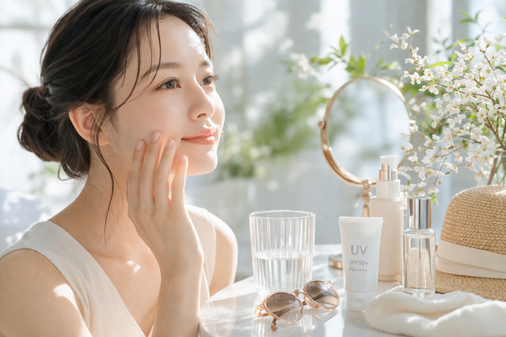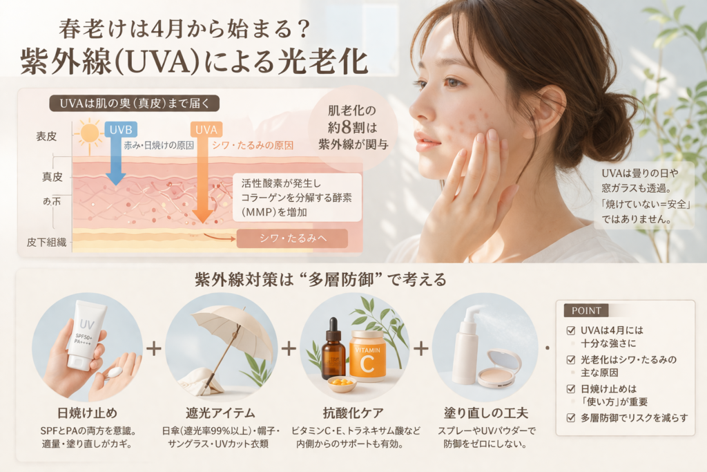 春は紫外線対策が遅れやすい一方で、光老化が静かに進みやすい季節です。特にUVAは、日焼けのような分かりやすい変化を伴わないまま、シワやたるみといった将来的な肌変化に関わってきます。